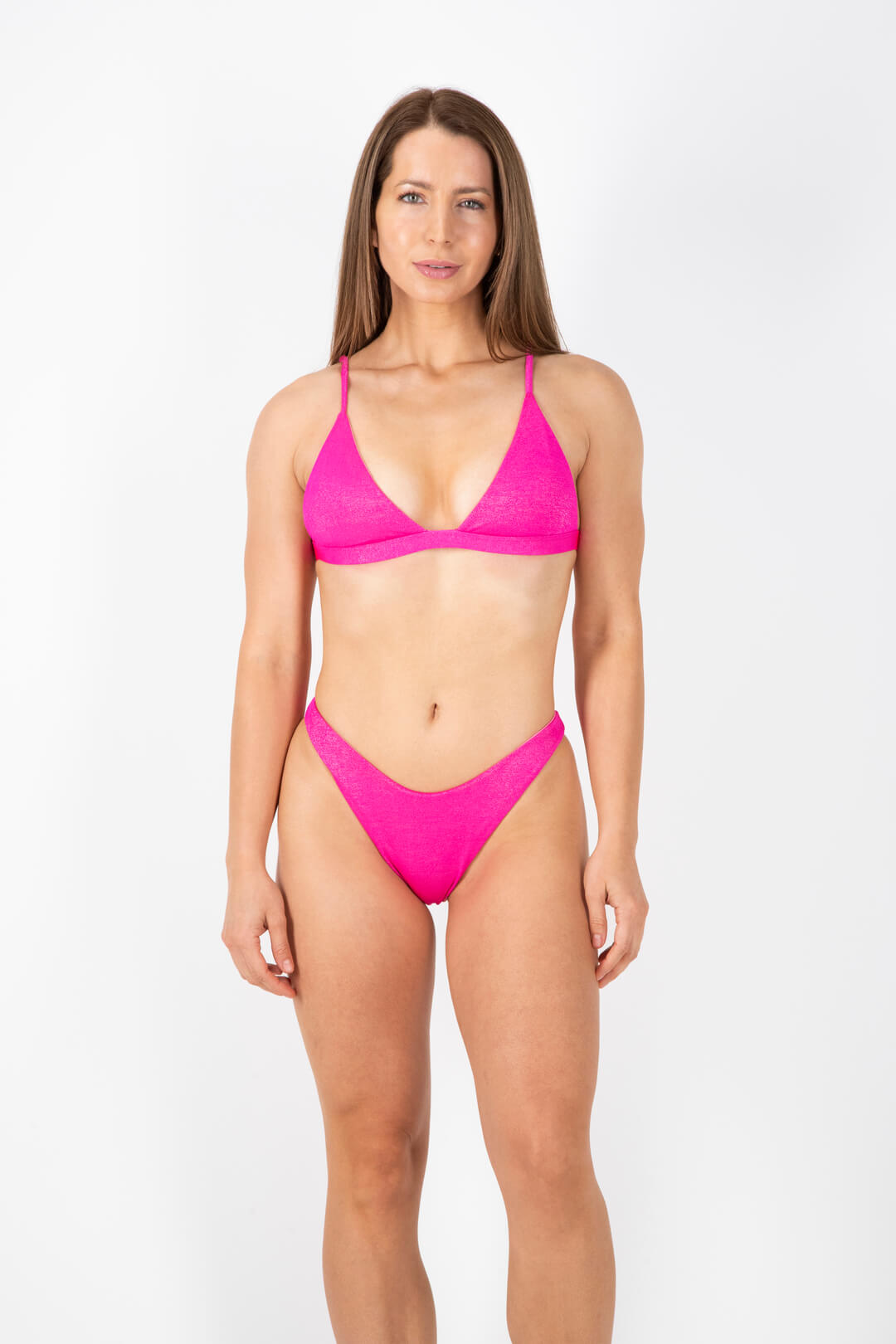 Top de bikini en color fucsia shimmer. Diseño de cobertura fija con relleno removible, tirantes y espalda ajustables.