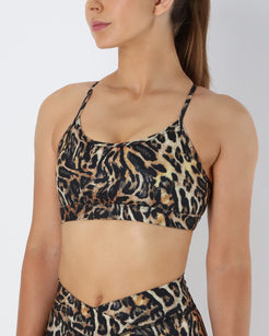 Peto deportivo con estampado animal print clásico. Diseño de soporte ligero con tirantes cruzados ajustables en la espalda. Incluye relleno removible y tecnología transpirable.
