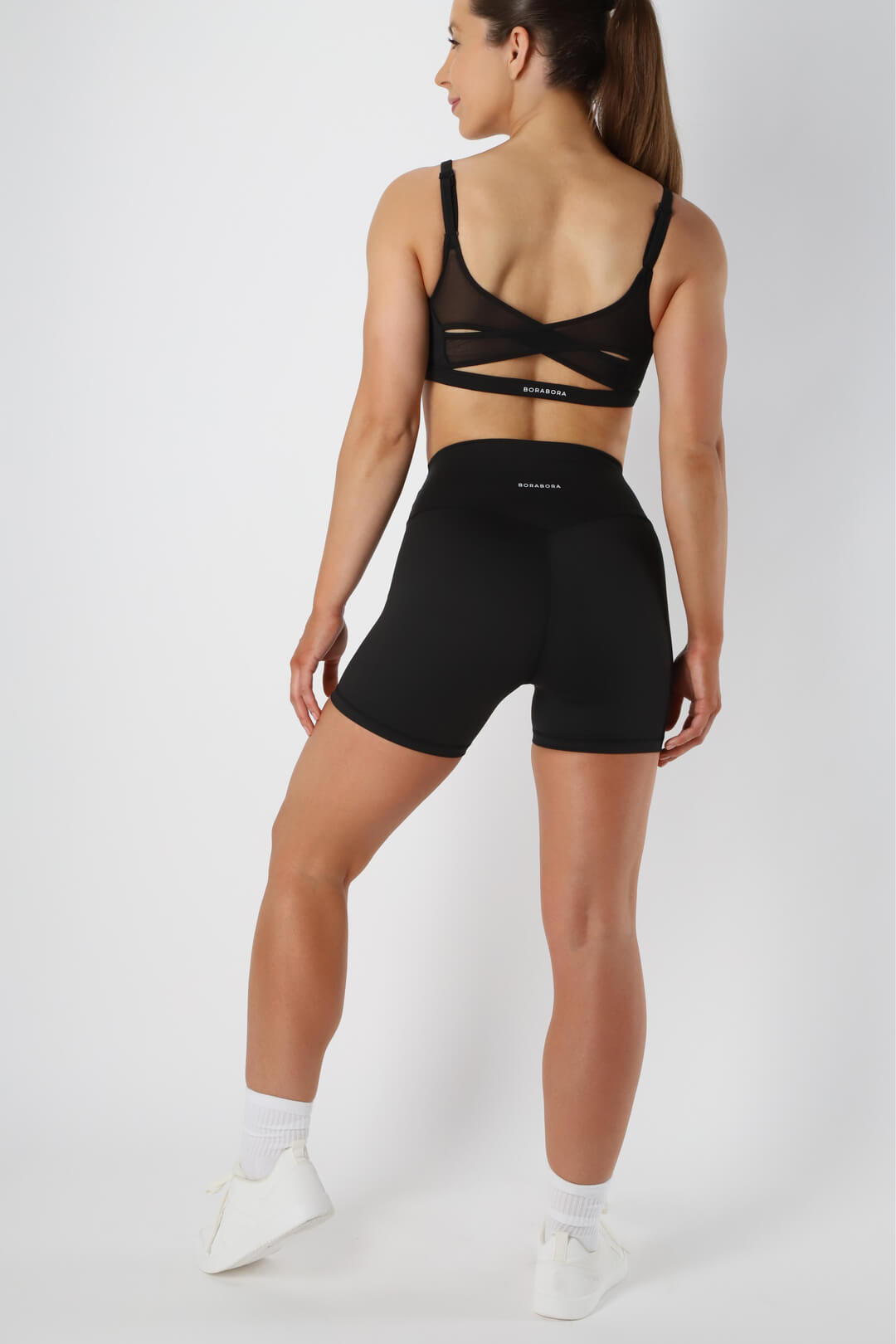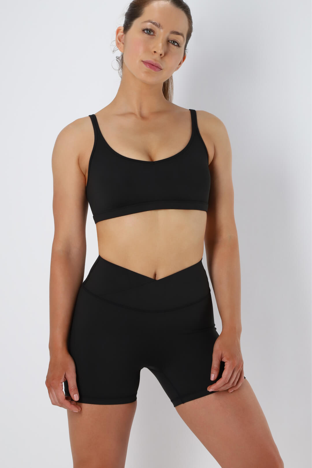 Short deportivo de tiro alto en color negro con corte en V en la cintura. Proporciona ajuste seguro, cobertura total sin transparencias y tecnología respirable incorporada.