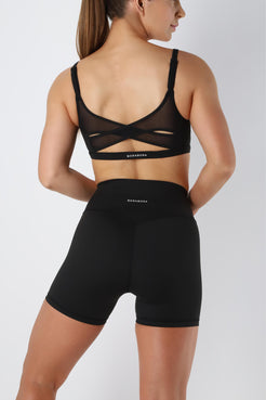 Peto deportivo en color negro con tirantes ajustables y espalda cruzada con malla transparente. Diseño de soporte ligero con relleno removible y tecnología respirable incorporada.
