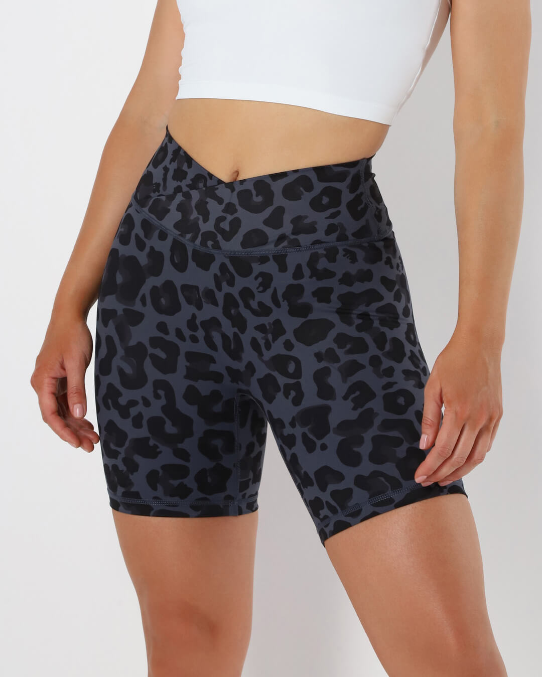 Short deportivo de tiro alto con estampado animal print en tonos grisáceos y negros y corte en V en la cintura. Proporciona ajuste seguro, cobertura total sin transparencias y tecnología respirable incorporada.
