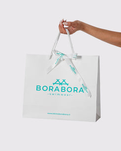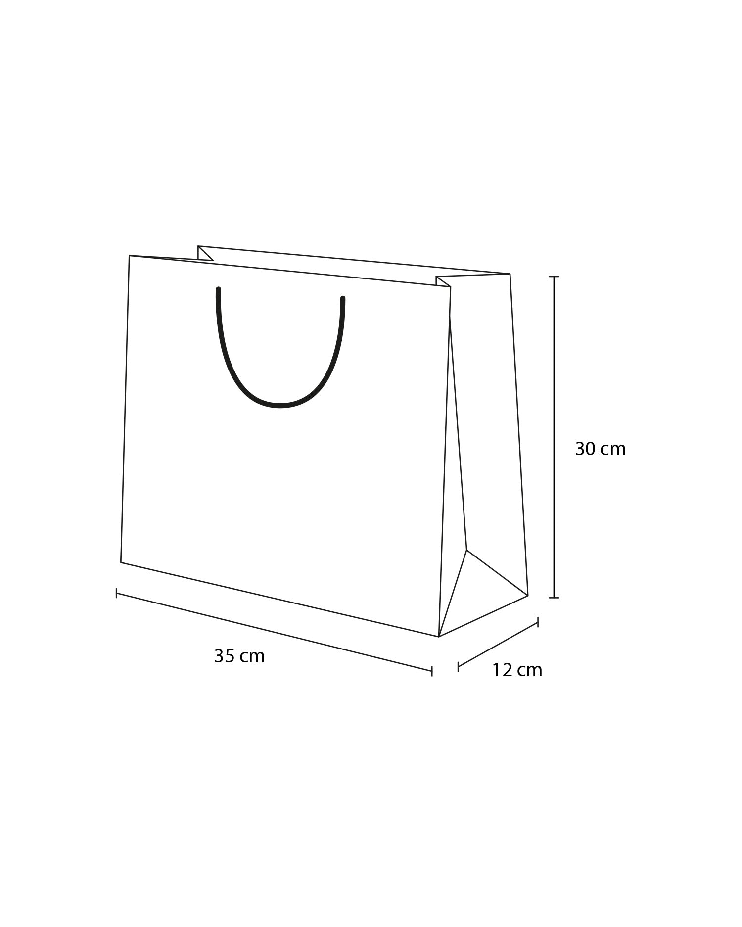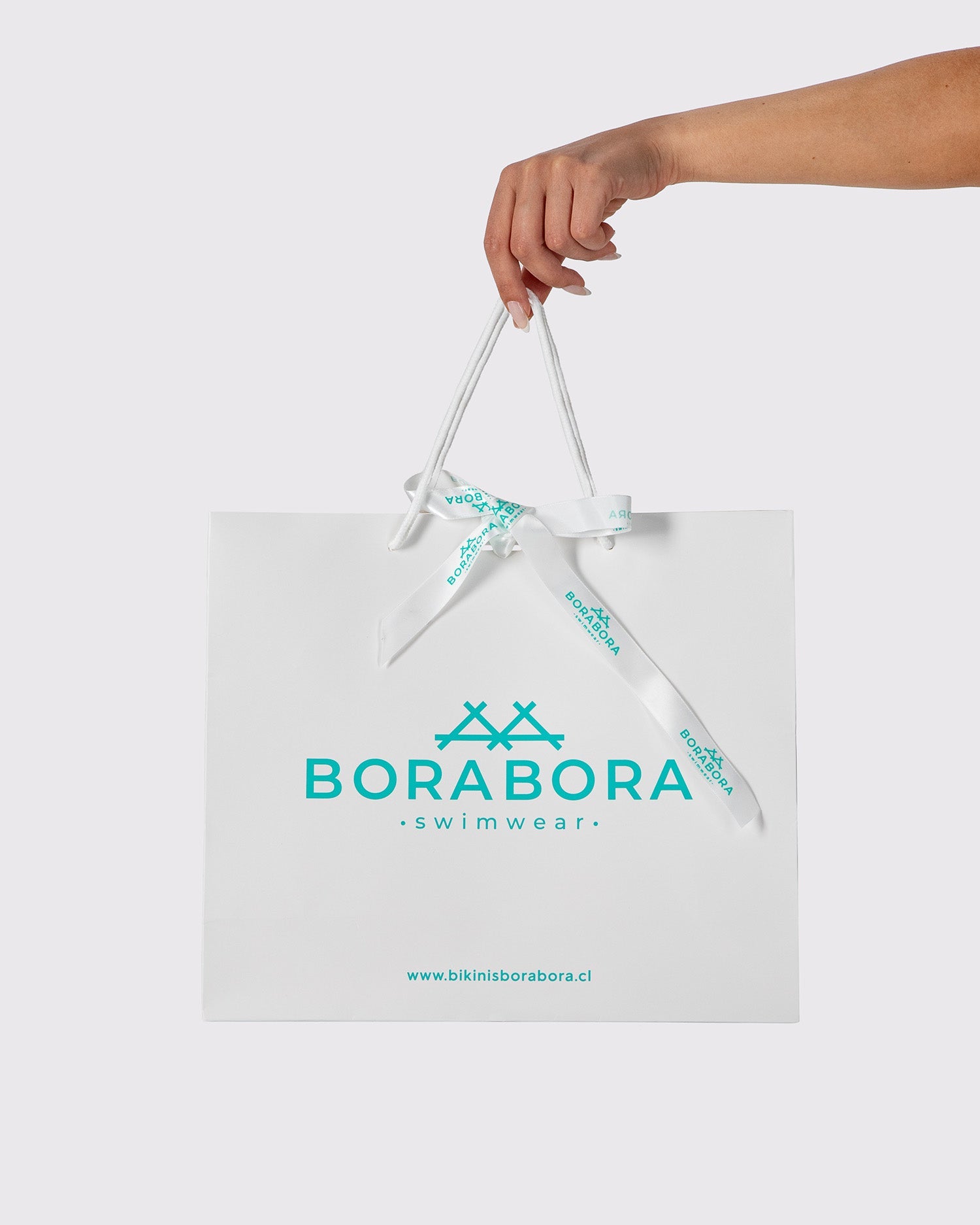 Bolsa de cartón blanco con asas blancas y cinta para cierre, ideal para regalos.