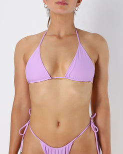 Top de bikini triangular sin relleno, con cobertura regulable. Tirantes con detalle metálico en las puntas.