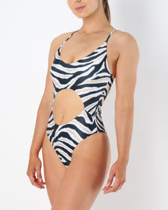 Traje de baño de una pieza con abertura central y relleno removible. Espalda descubierta con tirantes regulables.