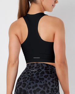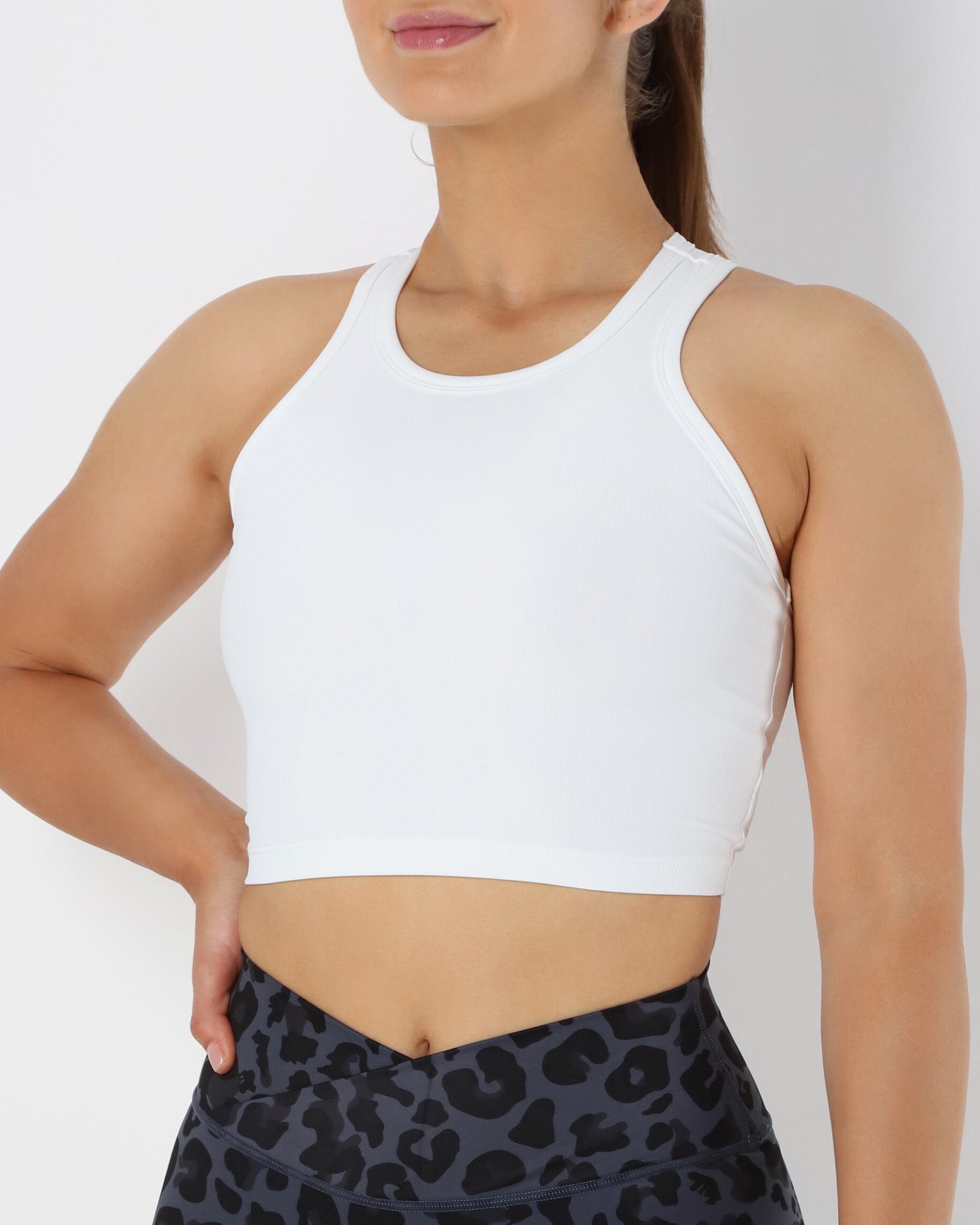 Polera deportiva de cuello halter, confeccionada en tela rib elástica y suave. Diseño con tecnología respirable incorporada.